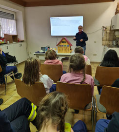 Am 25.10.25 hielt Klaudia Witte einen Vortrag über die Biologie der Wildbienen und wie man ihnen helfen kann. Beim Bau eines Insektenhotels sind viele Dinge zu beachten und was passiert eigentlich in so einem Insektenhotel. Auf diese Fragen und weitere gab Klaudia Witte in einem kurzweiligen und anschaulichen Vortrag die Antworten. Die Jugendlichen werden ein großes Insektenhotel bauen, daher waren die vielen Tipps willkommen. Im Frühjahr wird Bernd Mosler einen Workshop zu den Nahrungspflanzen der Wildbienen in Ruderdorf anbieten.